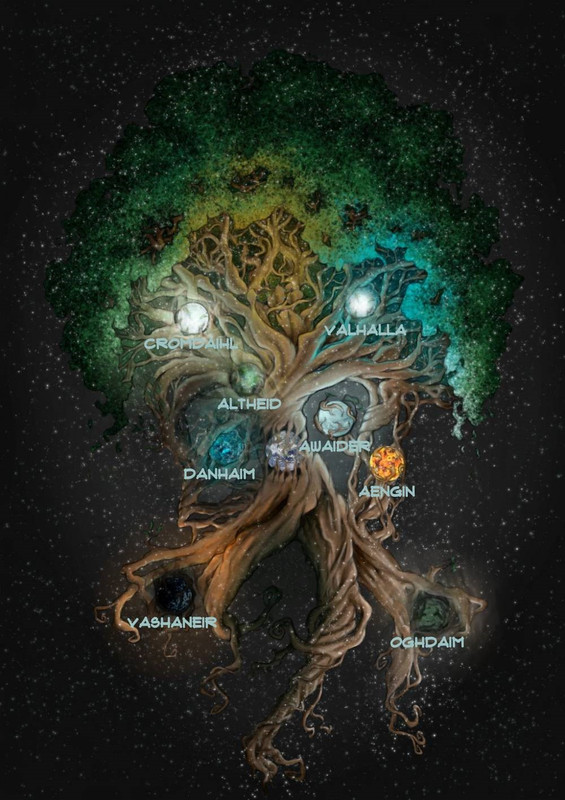 Egli diede quindi forma a quattro nuovi luoghi, due di essi posti nelle regioni più lontane del Ginnungagap, celati nell’oscurità delle radici dell’Yggdrasil, Oghdain e Vashaneir, e altri due posti in cima all’albero, sui rami più alti, dove splendono le gemme che crescono tra le fronde e che molti chiamano astri o stelle, i quali vennero chiamati Cromdahil e Valhalla. Decise quindi di dare la mortalità alle sue creazioni e separarle nella morte, destinando i defunti in questi quattro luoghi.
