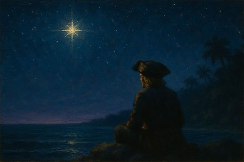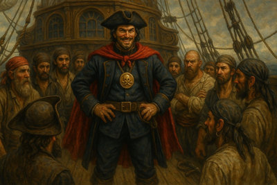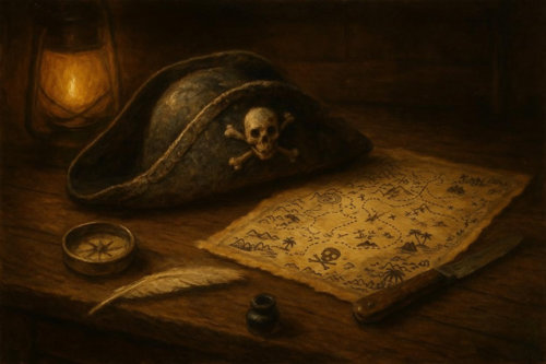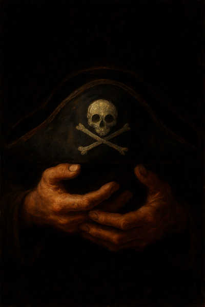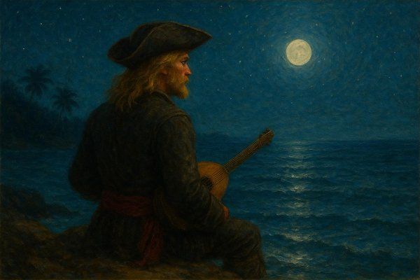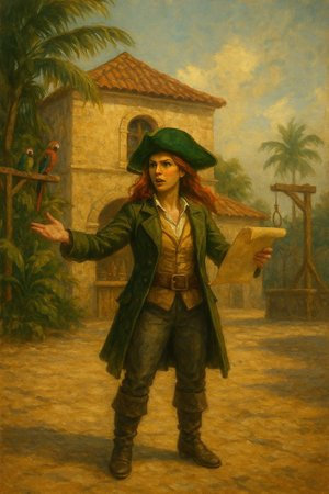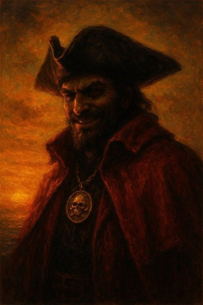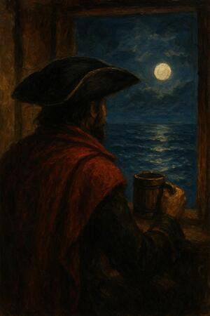 Il Capitano, sorseggiando l’amato nettare pirata, sorride senza rivolgere lo sguardo altrove se non sul mare attraverso la finestra. Poggia nuovamente il boccale sul tavolo e comincia a parlare come se vedesse alcune scene riflesse tra le fiamme del caminetto della locanda che dona un caldo tepore.