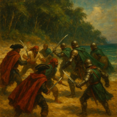 «Quindi, dicevo, salpammo a bordo della Perla di Danu e, consultando la mappa, attraccammo nella parte meridionale dell’isola, esattamente dove è ora alla fonda. Tuttavia trovammo qualcun altro sull’isola oltre agli indigeni. Alcuni hammin, non so come, erano riusciti a raggiungere Tortuga e volevamo appropriarsene. Credo sia inutile dirlo, no? Ce le siamo date di santa ragione! Gli scontri furono da subito violenti e diventarono sempre più cruenti: mentre gli hammin si insediarono nella parte settentrionale dell’isola, noi ci stanziammo nella parte meridionale. I combattimenti durarono qualche mese ma, alla fine, vista la nostra superiorità in battaglia, gli hammin se ne fuggirono con la coda tra le gambe e se ne tornarono alla loro città di pietra. Quello fu davvero un altro grande giorno, il primo in cui demmo una meritata lezione a chi osava mettersi contro i Corsari Scarlatti».