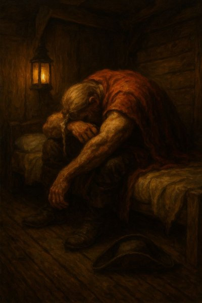 Un giovane allegro, con una bandana scarlatta e un medaglione vistoso che gli esce fuori da una camicia forse un tempo appartenuta a un nobile, si avvicina al Capitano poggiando sul tavolo una bottiglia di grog appena spillata dal barile di Bruma, il Cuoco di Bordo. Il Capitano alza un attimo lo sguardo verso lo straniero, che poi tale non era.