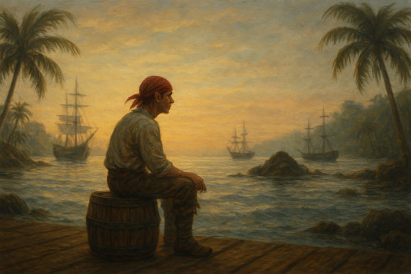 Quest’ultimo Corsaro Scarlatto era tornato dopo cinque anni lontano da Tortuga, e ciò aveva riportato alla memoria di Doblone tanti episodi del passato, rendendo il Quartiermastro ancora più nostalgico di quanto non lo diventasse dopo svariati bicchieri di grog.