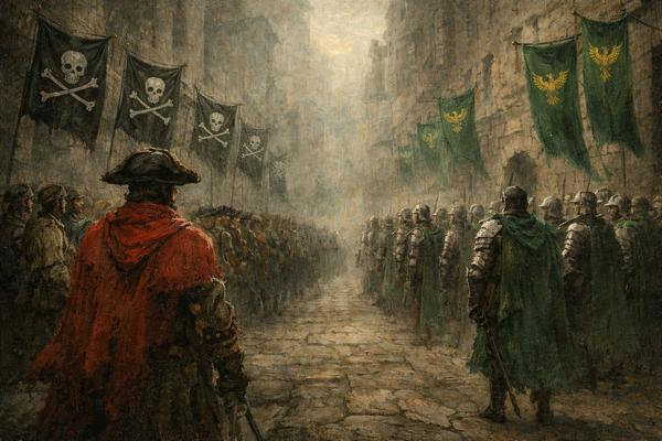 Dall’altro lato della strada Linguadoro passava in rassegna i suoi uomini, imitando il comandante in capo Hangius, che faceva lo stesso coi propri. Presto avrebbero sferrato un ennesimo assalto alle mura, falciando nemici, mietendo vittime. Non aveva mai visto la ciurma tanto decisa, mai.