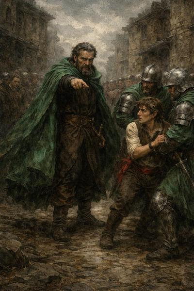 Sistemando gli arcieri ai lati della strada l’occhio gli cadde sull’edificio in cui lavorava il vecchio pazzo banditore Auldan. Vecchio e pazzo, già, ma tanto simpatico. Aveva ancora vivido nella memoria il primo incontro con lui quando, insieme ad un altro povero ragazzo, andò a chiedere di essere annoverato tra le fila dei mantelli verdi, pieno d’orgoglio.