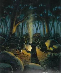 La Madre, in un ultimo tentativo, inviò i Druidi a parlare con i Draghi. In nome del rispetto per Lei, i Draghi giurarono eterna amicizia ai Druidi, unici Antropomorfi che avessero rinunciato a muovere loro la guerra, e i Druidi si impegnarono a predicare per sempre, anche se fosse stato inutile, la Via della Madre e il rispetto per i Draghi. Ciò non bastò a dissuadere i Draghi stessi dal loro giuramento, e allora la Madre pensò all’ultima possibilità: creò su un altro mondo un ambiente uguale ad Ardania, ma distante un numero di passi che nessun potrebbe contare. Creò un mistico portale, e tutti i Draghi lo varcarono, andando a vivere in quel mondo. MA l’ultimo di essi, prima di varcarlo, proferì queste parole, urlando con una voce così possente che, si narra, fu udito da tutta la terra: “Esseri a due piedi, noi andiamo via da questo mondo, conservando nel cuore il desiderio di vendetta. Alla Madre, che ci ha creati, obbediamo. Ma Ella non ci ordina di rimanere per sempre lontano da voi, e se potremo, torneremo!”