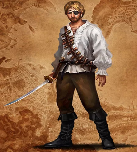 Sopravvissuto a battaglie, assassinii, intrighi politici e loschi affari, il Filibustiere è anzitutto un combattente pericoloso e letale, senza scrupoli, abituato a cavarsela nelle situazioni più critiche, disposto a spargere sangue in cambio di ricchezze materiali, che mette la sua abilità al servizio del Capitano. Figura di grande spessore, su di esso si narrano numerose imprese e leggende. E' avvolto in un alone di mistero e grazie alla sua grande esperienza gode di un indiscusso rispetto da parte dell'intera ciurma. E' dunque una vecchia gloria di Tortuga che facendosi da parte si è privata della possibilità di intervenire direttamente sull'andamento della Ciurma e, in generale, di Tortuga. Tuttavia il Capitano stesso, proprio per in virtù dell'esperienza del Filibustiere, di tanto in tanto, si rivolge a lui per faccende estremamente delicate ed importanti.