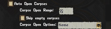 - Se abilitata, l’opzione consente l’apertura automatica dei corpi di PG e NPC semplicemente avvicinandosi. Il parametro Corpse Open Range definisce il numero di tile entro cui i corpi si aprono automaticamente.