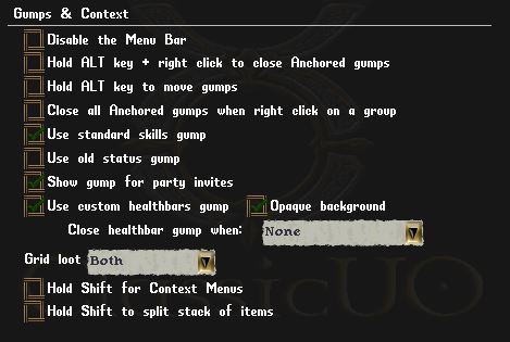 - Hold ALT key + right click to close Anchored gumps. Questa opzione, se attivata, fa chiudere i tutti i gump quando sono raggruppati solo se si tiene premuto il tasto ALT mentre si clicca col tasto destro del mouse.