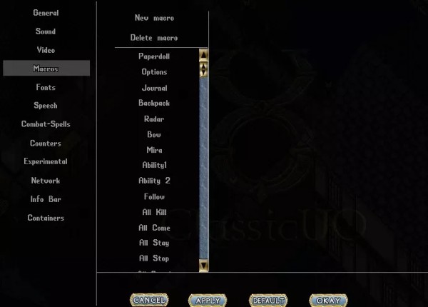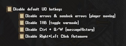 - Disable default UO hotkeys: disabilita i tasti rapidi predefiniti di Ultima Online. E’ possibile poi selezionare nello specifico quale tasto o combinazione predefinita di tasti non si vuole mantenere.