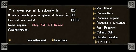 - Se si desidera vendere un contenitore con dentro oggetti (es. un cofanetto con set di armi o armature), si deve preparare tutto in anticipo e poi inserirei l’intero contenitore nel vendor, specificando il prezzo e una descrizione unica.