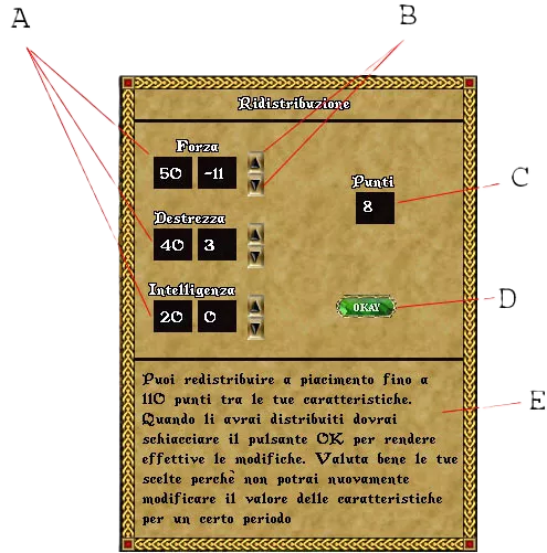 - A sinistra: valore attuale della statistica (Forza, Destrezza, Intelligenza).