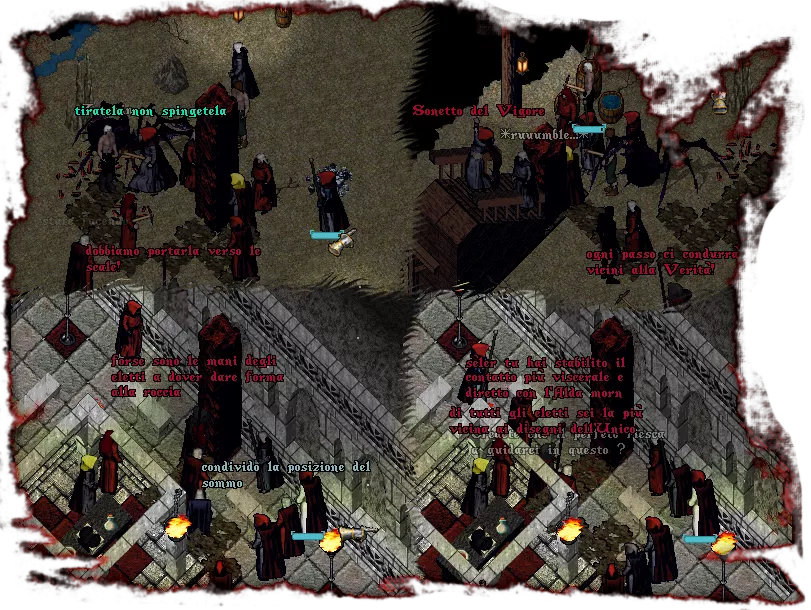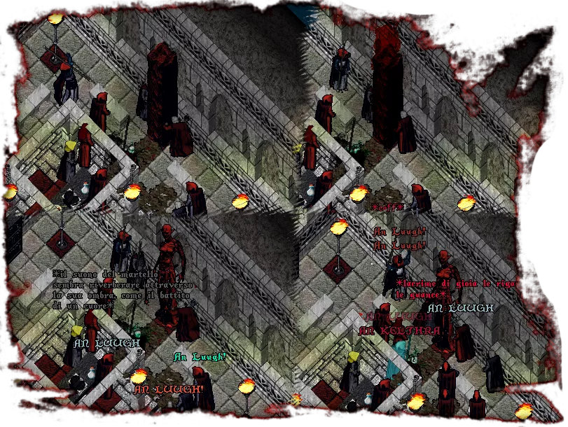L’aria parve addensarsi e l’oscurità calò su tutti noi, era come trovarsi all’interno dell’abisso che ospita il Perfetto mentre i colpi di Virhael generavano lampi; era come se scandissero il tempo della nuova venuta del nostro Signore. La forza della nostra fede unita alla volontà della Amil Yaren permisero alla statua di nascere, colpo dopo colpo l’effige sacra del Padre veniva modellata finché non si stagliò definitivamente nella sua feroce bellezza.
