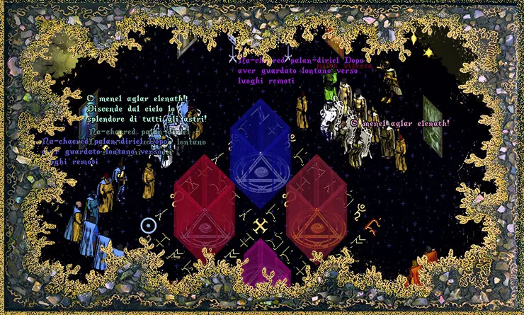 Il Primo Astro Isil Herenvarn, seguito dalla Amil en’Morrigan Midne Merwen, benediva e guidava i fedeli, accogliendo con passi lenti la notte che scendeva, conducendo tutti fino al tempio quadrato, equilibrio di sfere arcane, ove introdurre il cerimoniale.