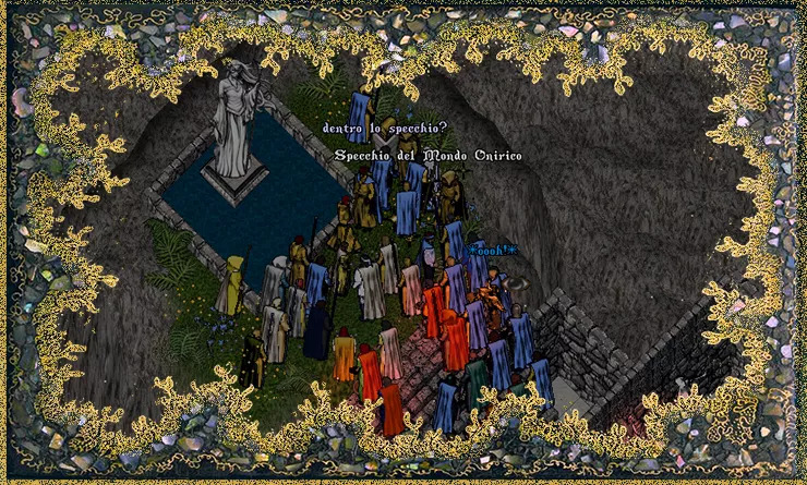 E poi, come se il sogno stesso fosse ora il presente di ogni convenuto, guidati dal Vertice Tilgilya, tutti vennero invitati sulla sommità del tempio, dove la grande vasca, costruita attorno alla statua di Morrigan, crea l’effetto di un buio abbraccio di onde e luci stellari. Proprio lì, infatti, un passaggio magico conduceva i presenti in una dimensione altra, l’onirico palcoscenico voluto dalla Delegazione del Buon Risveglio, dove tutto poteva essere custodito, come in uno scrigno prezioso.