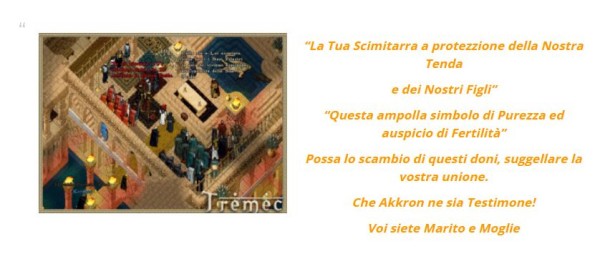 “La Tua Scimitarra a protezzione della Nostra Tenda e dei Nostri Figli”“Questa ampolla simbolo di Purezza ed auspicio di Fertilità”Possa lo scambio di questi doni, suggellare la vostra unione.Che Akkron ne sia Testimone!Voi siete Marito e Moglie